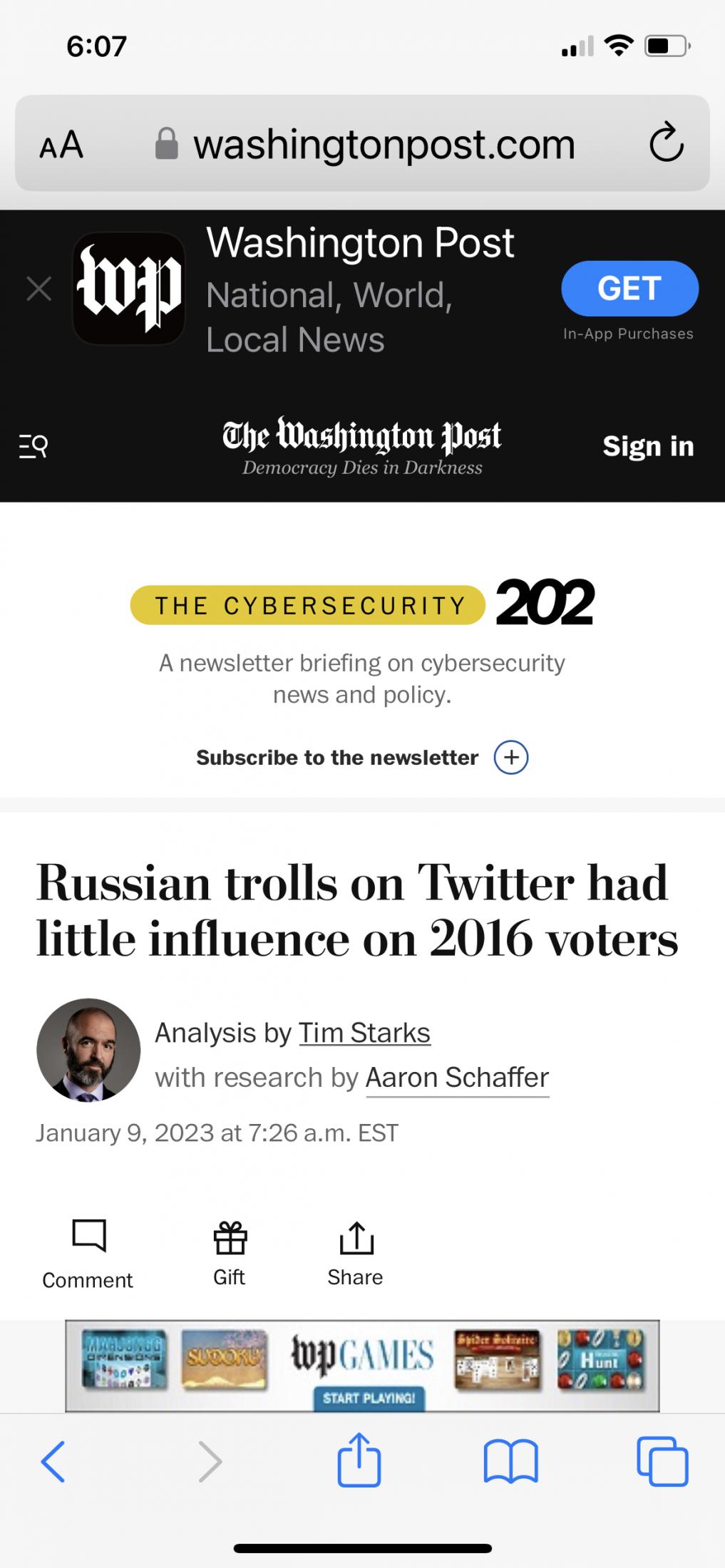 Dept of Justice found that Russia “interfered in the 2016 presidential election in sweeping and systematic fashion,” including using social media. DOJ has access to classified info. Musk and Taibbi do not.